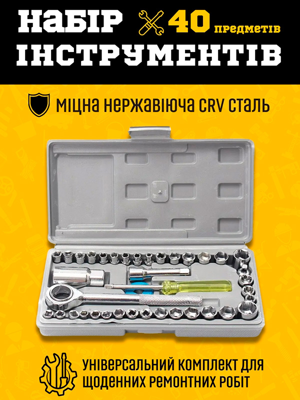 Набір інструментів у кейсі 40 предметів — це універсальний комплект для щоденних ремонтних робіт, обслуговування техніки, автомобільних задач та побутового використання. Він містить 36 шестигранних головок різного діаметра, що дозволяє працювати з широким спектром кріплень.