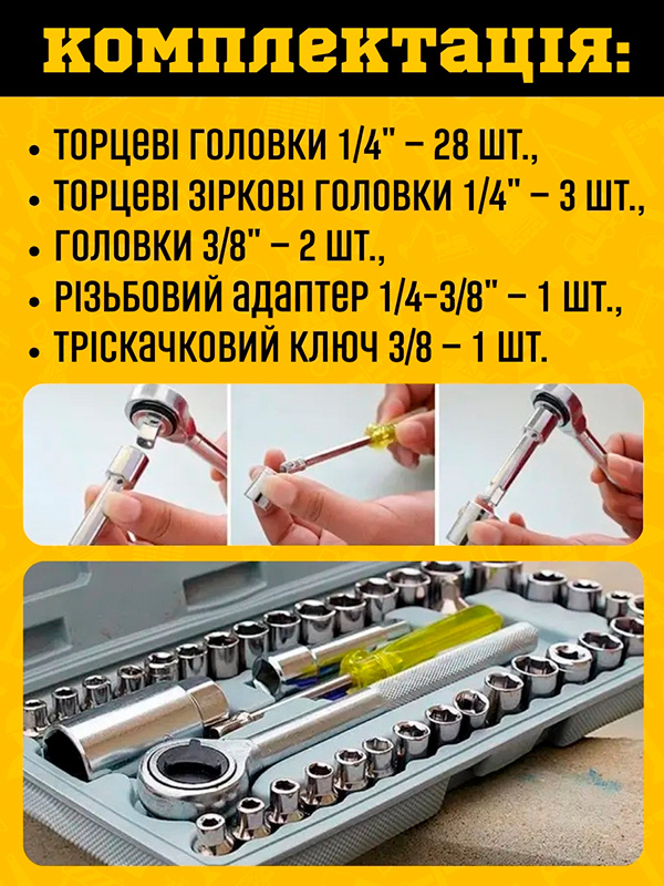 Набір інструментів у кейсі 40 предметів — це універсальний комплект для щоденних ремонтних робіт, обслуговування техніки, автомобільних задач та побутового використання. Він містить 36 шестигранних головок різного діаметра, що дозволяє працювати з широким спектром кріплень.